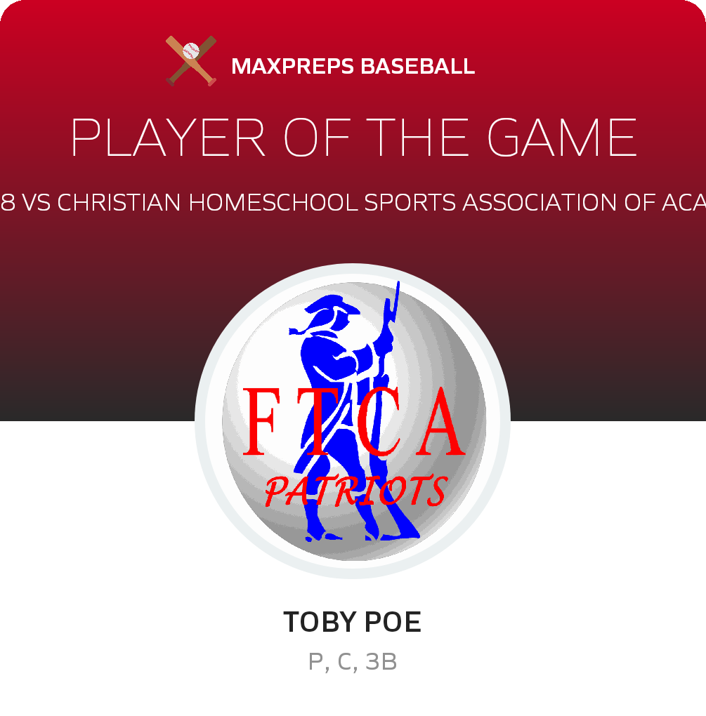 Congratulations to #33 Toby Poe for being selected the Faith Training Christian Academy Baseball Player of the Game.