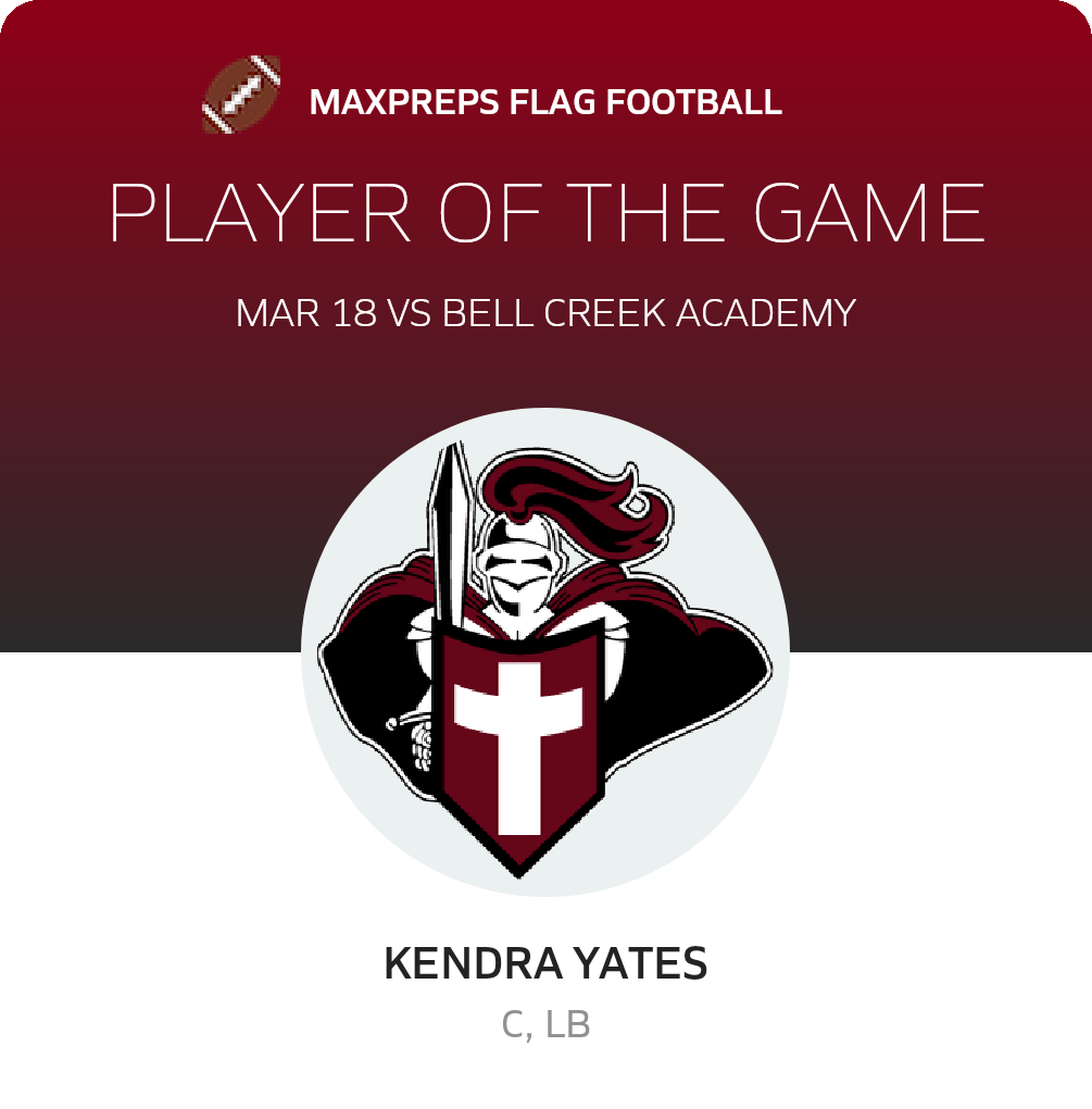 Congratulations to #2 Kendra Yates for being selected the Seffner Christian Girls Flag Football Player of the Game.