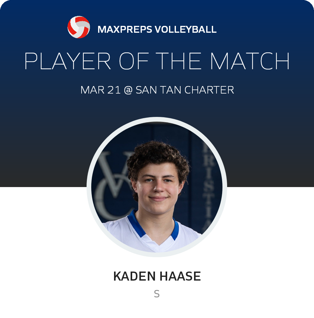 Congratulations to #17 Kaden Haase for being selected the Valley Christian Boys Volleyball Player of the Match.