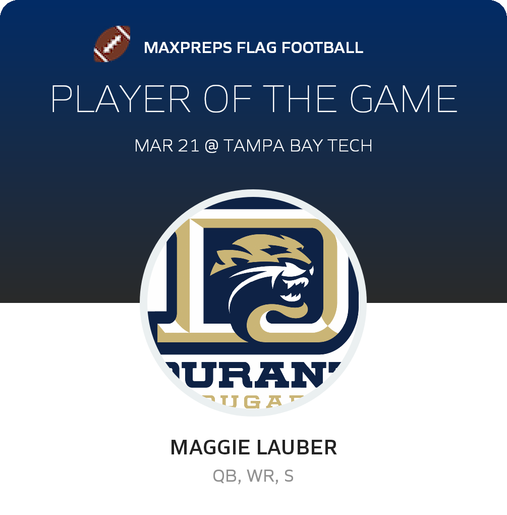 Congratulations to #2 Maggie Lauber for being selected the Durant Girls Flag Football Player of the Game.