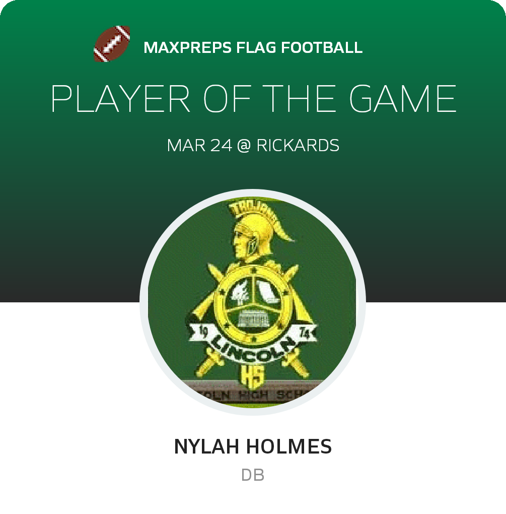 Congratulations to #3 Nylah Holmes for being selected the Lincoln Girls Flag Football Player of the Game.