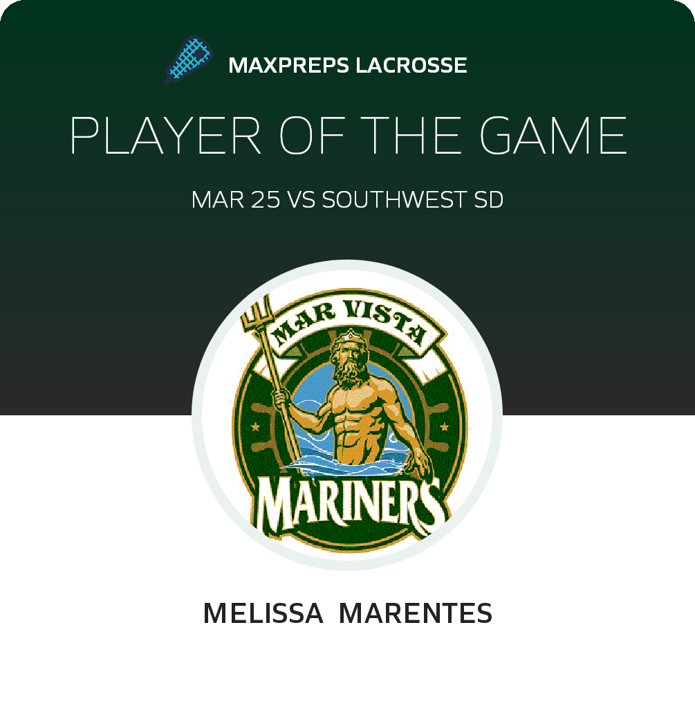 Congratulations to #20 Melissa Marentes for being selected the Mar Vista Girls Lacrosse Player of the Game.