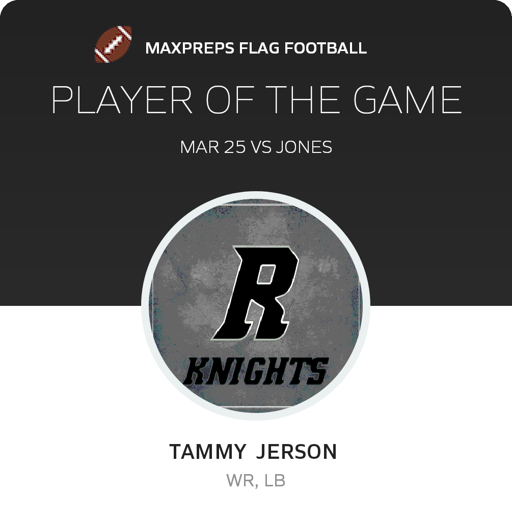 Congratulations to #20 Tammy Jerson for being selected the Robinson Girls Flag Football Player of the Game.
