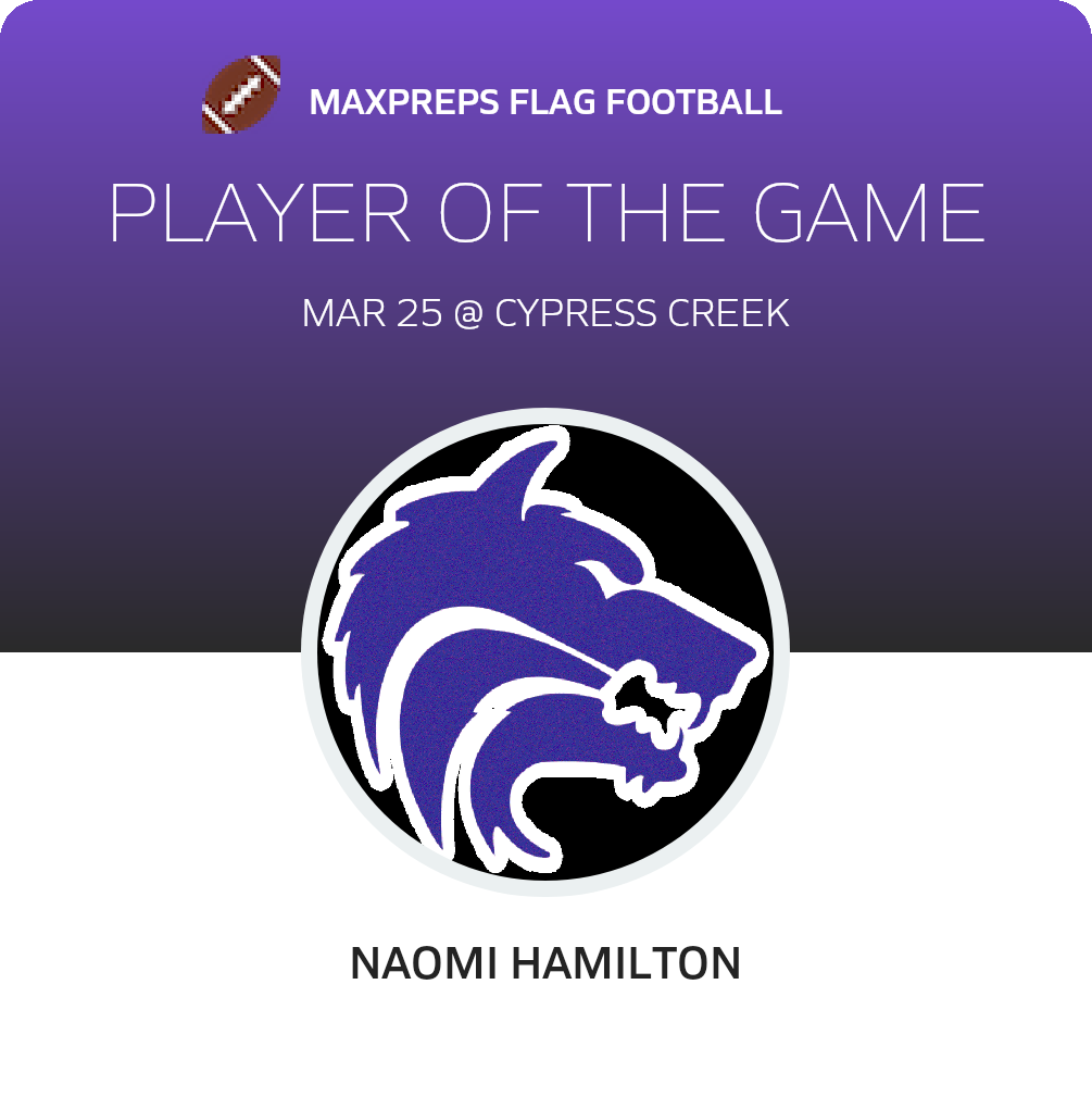 Congratulations to #21 Naomi Hamilton for being selected the Timber Creek Girls Flag Football Player of the Game.