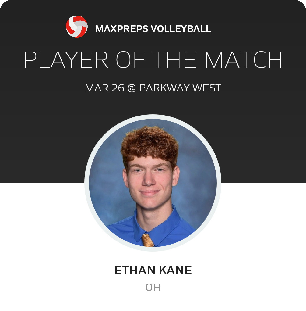 Congratulations to #11 Ethan Kane for being selected the Fort Zumwalt East Boys Volleyball Player of the Match.