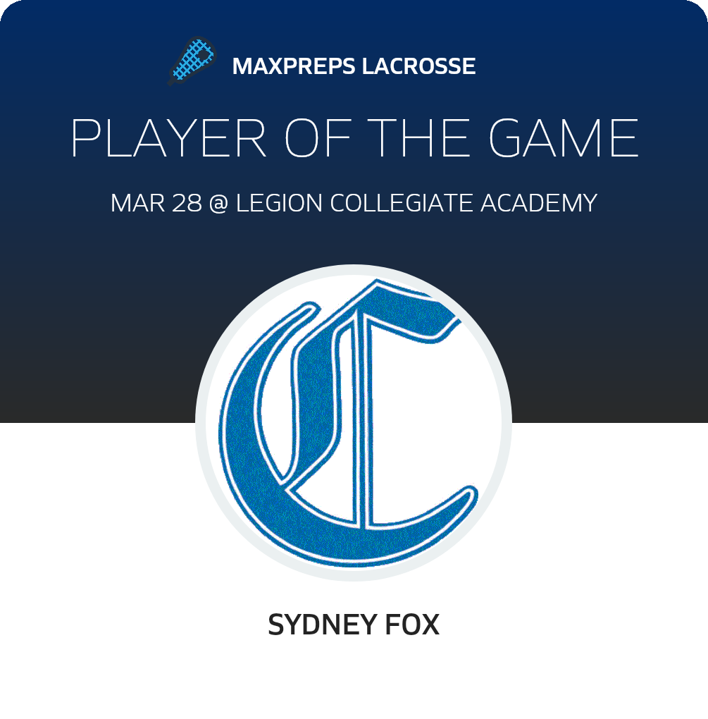 Congratulations to #13 Sydney Fox for being selected the Charlotte Christian Girls Lacrosse Player of the Game.
