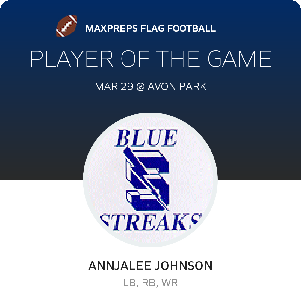Congratulations to #8 Annjalee Johnson for being selected the Sebring Girls Flag Football Player of the Game.