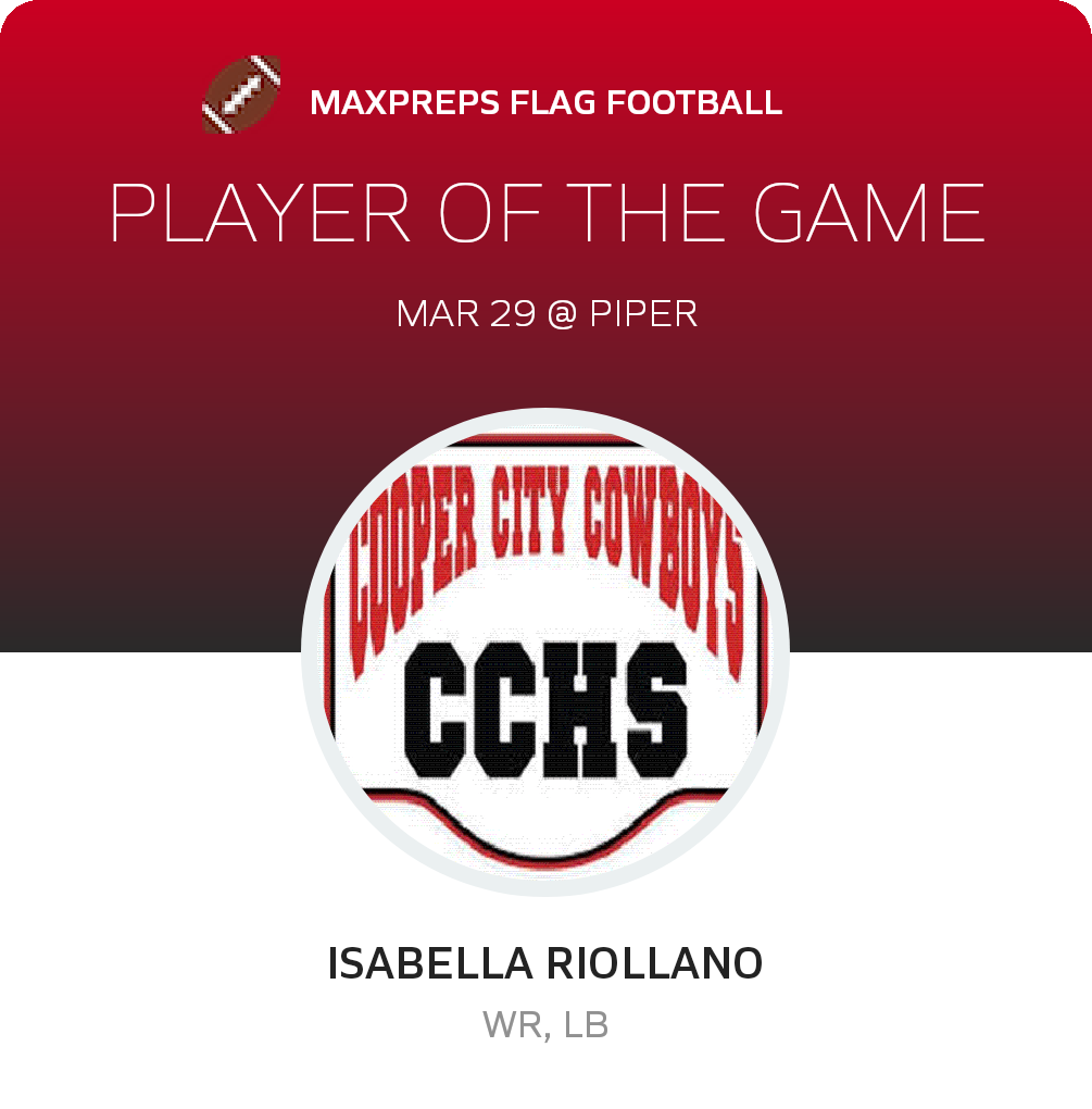 Congratulations to #23 Isabella Riollano for being selected the Cooper City Girls Flag Football Player of the Game.