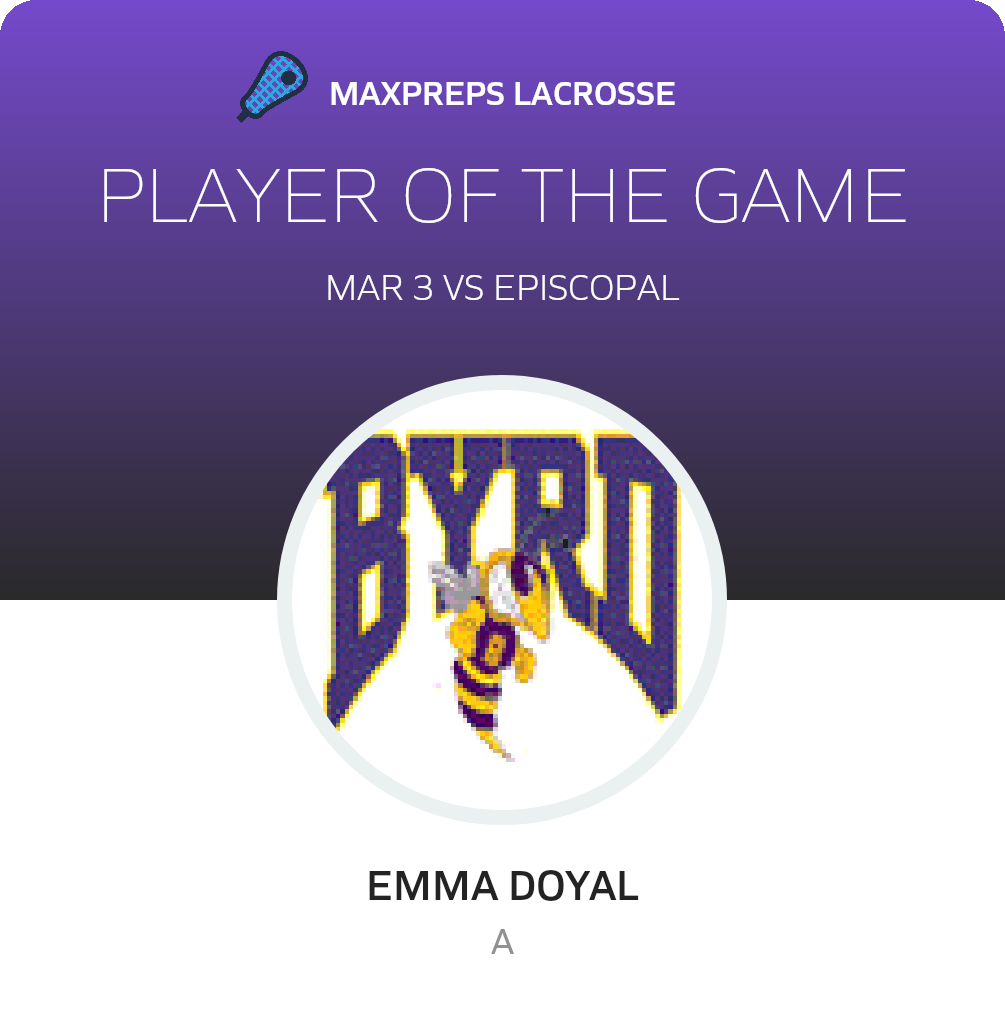Congratulations to #11 Emma Doyal for being selected the Byrd Girls Lacrosse Player of the Game.