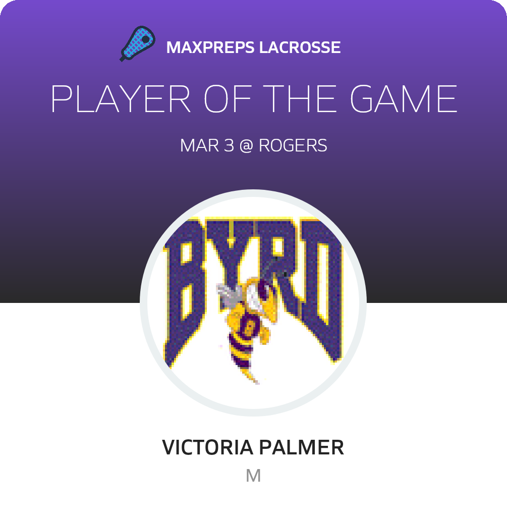 Congratulations to #13 Victoria Palmer for being selected the Byrd Girls Lacrosse Player of the Game.