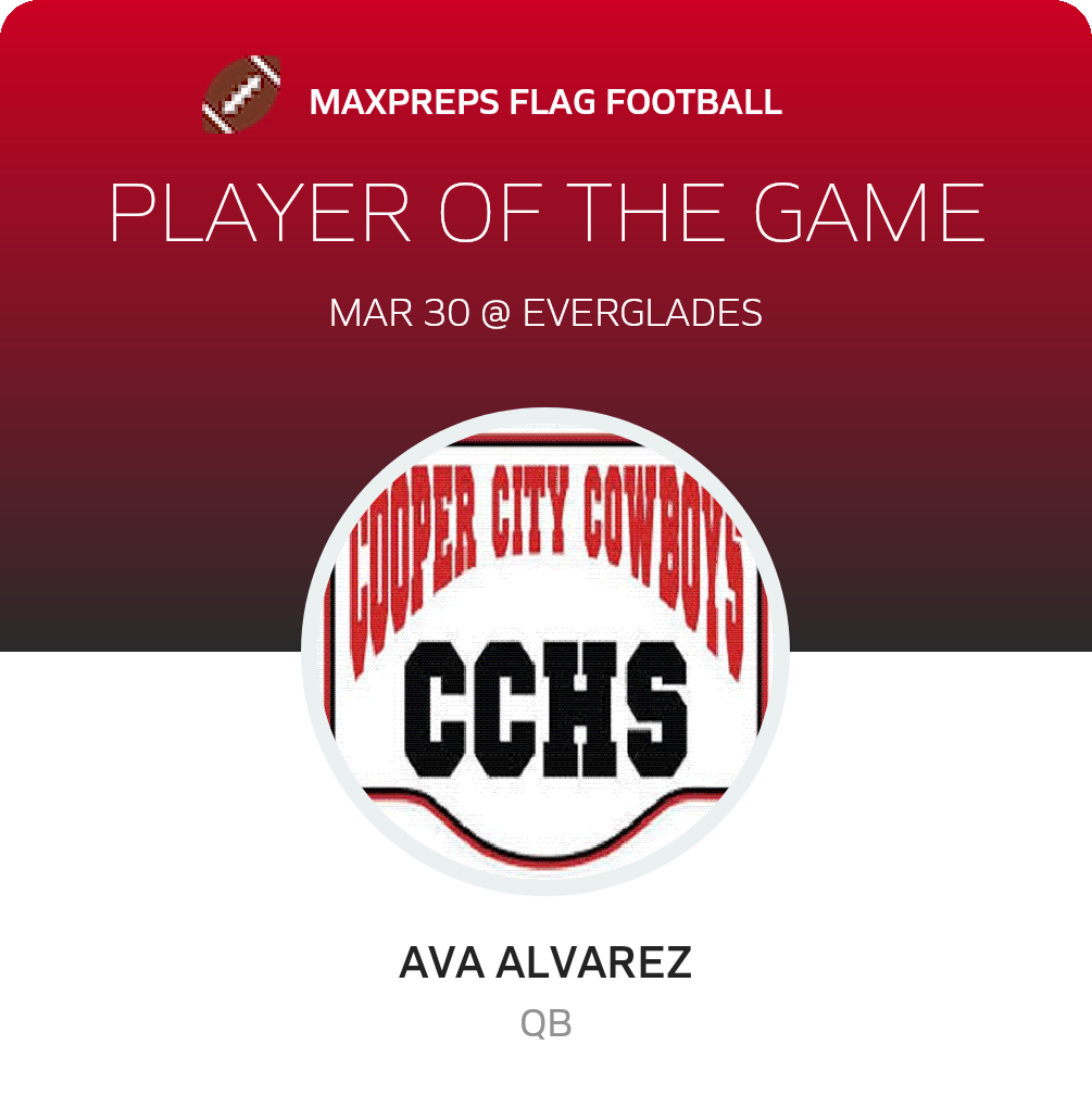 Congratulations to #21 Ava Alvarez for being selected the Cooper City Girls Flag Football Player of the Game.