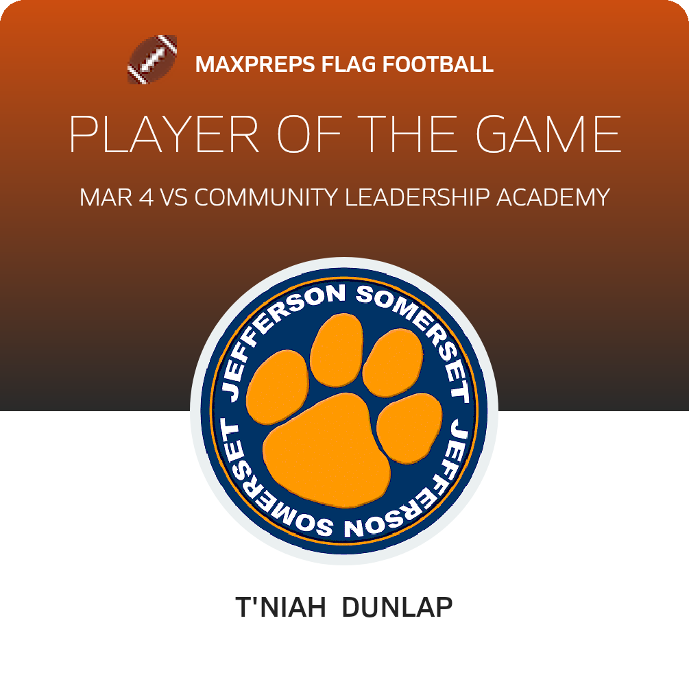 Congratulations to #22,20 T'niah Dunlap for being selected the Jefferson County Girls Flag Football Player of the Game.