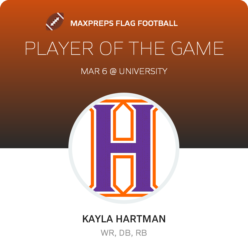 Congratulations to Kayla Hartman for being selected the Horizon Girls JV Flag Football Player of the Game.