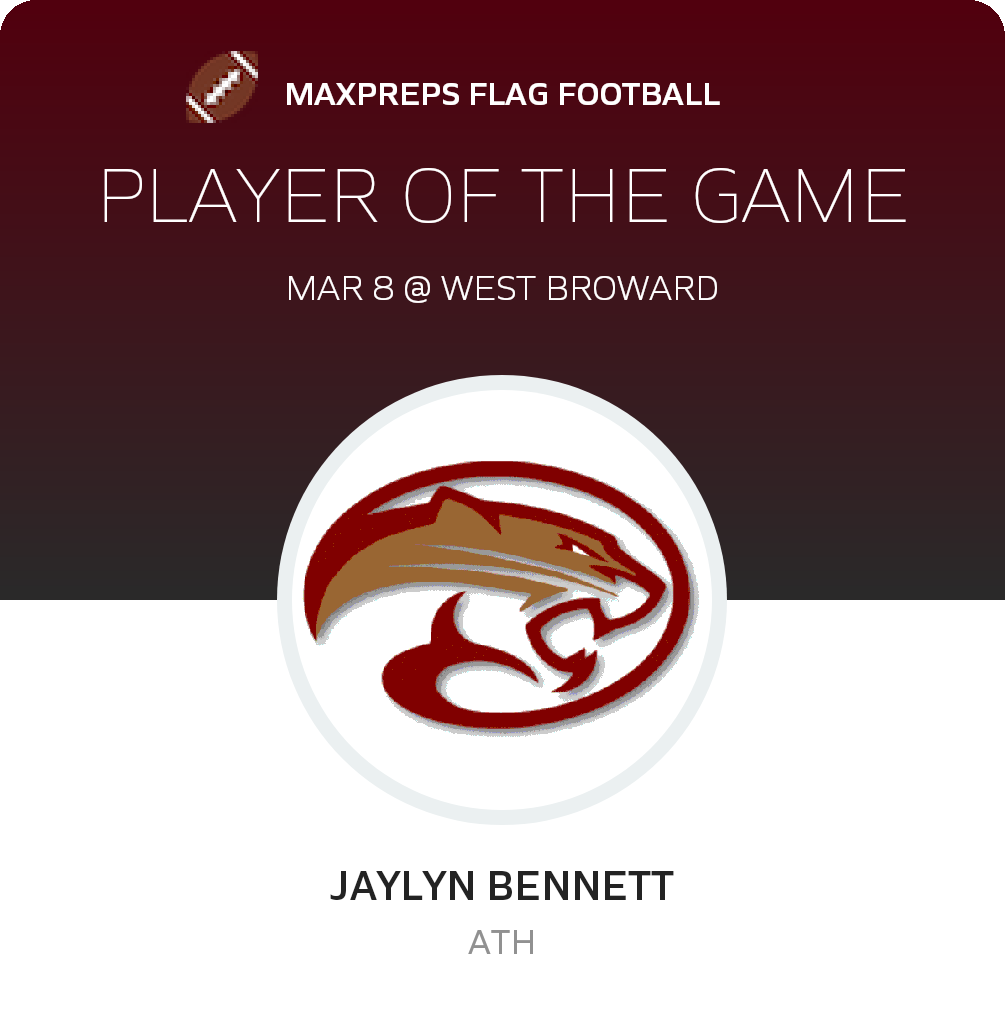 Congratulations to Jaylyn Bennett for being selected the Coconut Creek Girls Flag Football Player of the Game.