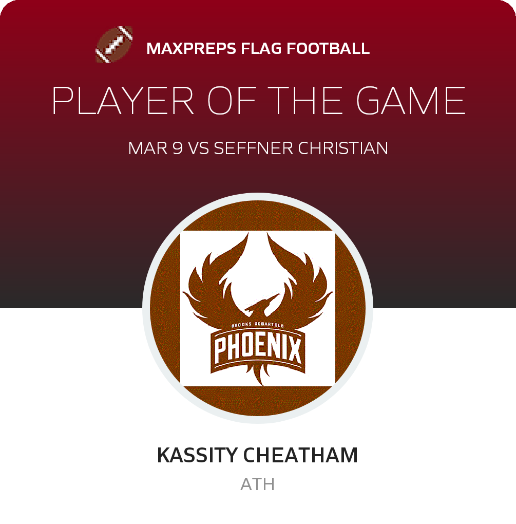 Congratulations to #12 Kassity Cheatham for being selected the Brooks DeBartolo Collegiate Girls Flag Football Player of the Game.