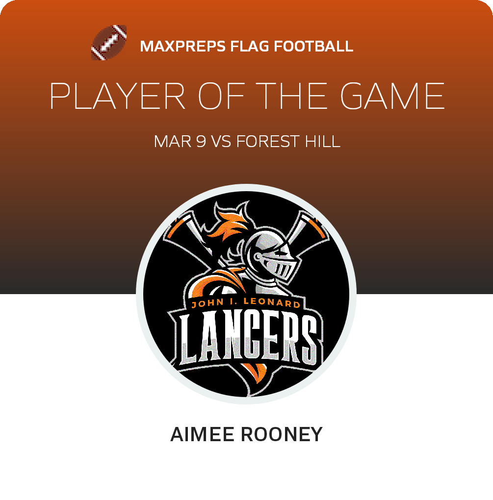 Congratulations to Aimee Rooney for being selected the Leonard Girls Flag Football Player of the Game.