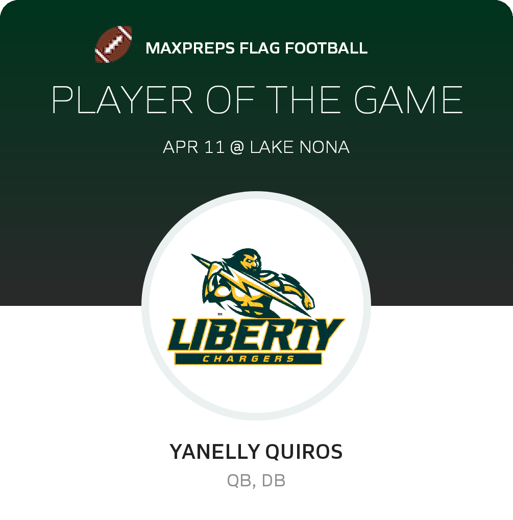 Congratulations to #2 Yanelly Quiros for being selected the Liberty Girls Flag Football Player of the Game.