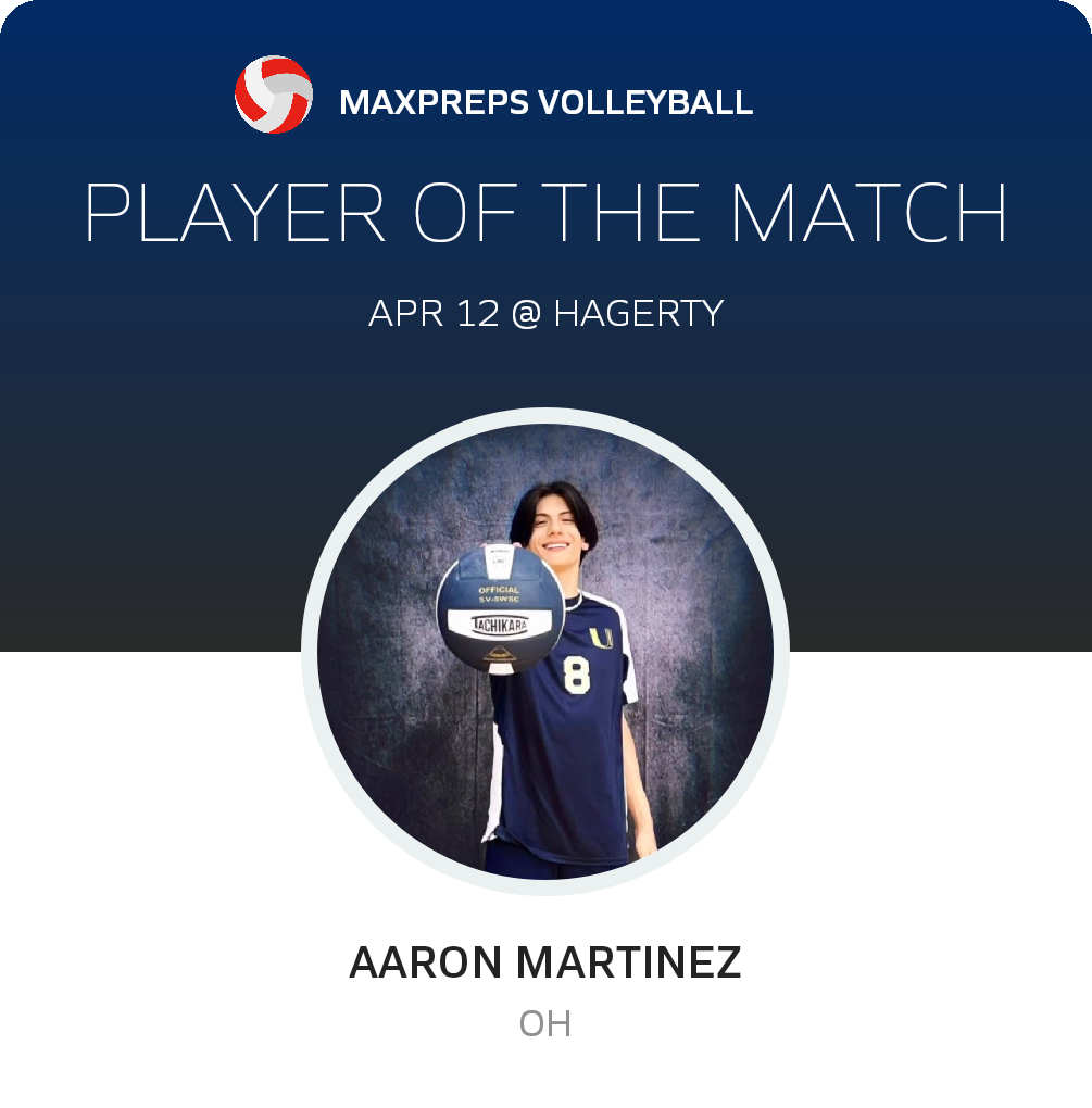 University High School defeated Hagerty High School 3-1 by scores of 21-25, 30-28, 25-13 and 25-21. Aaron Martinez led University with 11 kills and 5 blocks, while Fabian Cintron contributed 33 receptions and 15 digs.