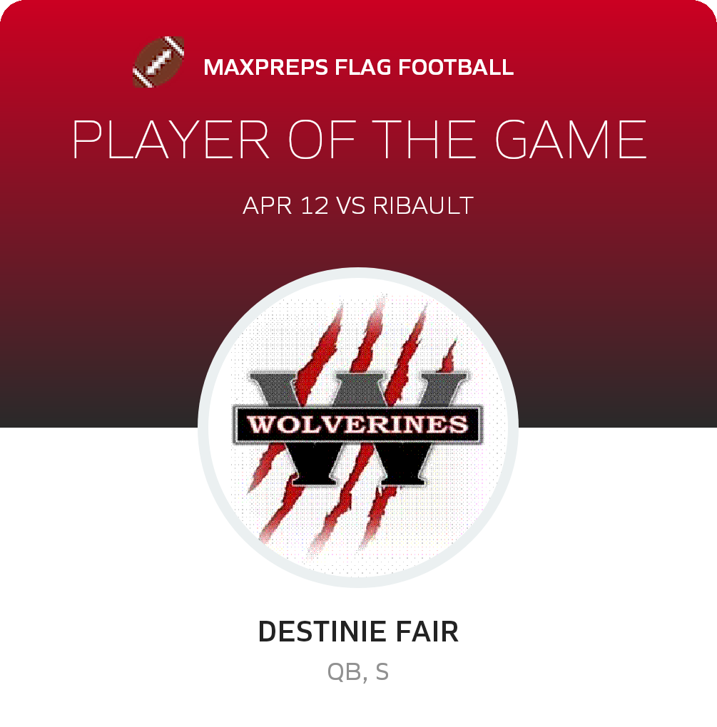 Congratulations to #2 Destinie Fair for being selected the Westside Girls Flag Football Player of the Game.