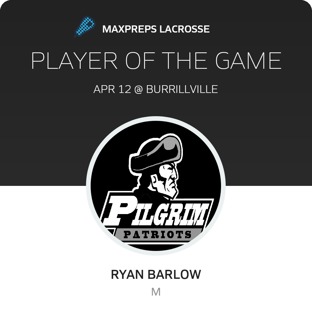 Congratulations to #7 Ryan Barlow for being selected the Pilgrim JV Lacrosse Player of the Game.
