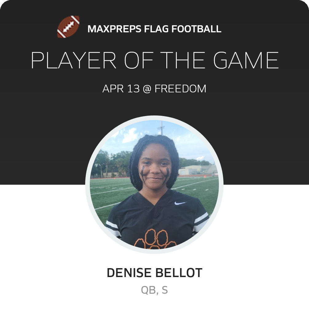 Congratulations to #13 Denise Bellot for being selected the Winter Park Girls Flag Football Player of the Game.