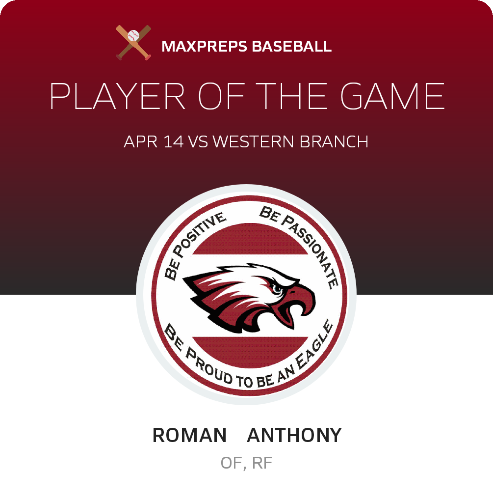 April 14, 2022: Parkland, FL 33076 In Thursday's non-league game, the host Stoneman Douglas Eagles baseball team scored a nice 11-1 victory over the Western Branch Bruins.