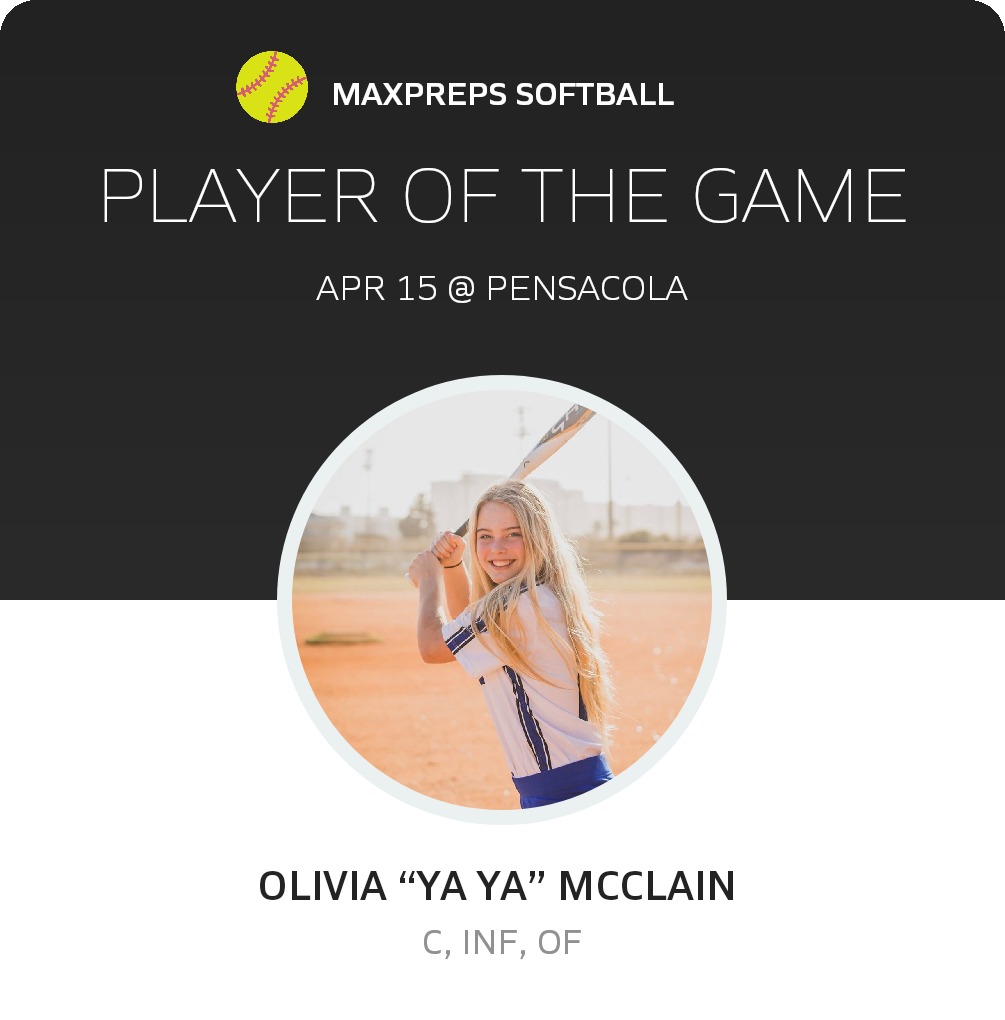 Congratulations to #12 Olivia “Ya Ya” McClain for being selected the Destin Softball Player of the Game.