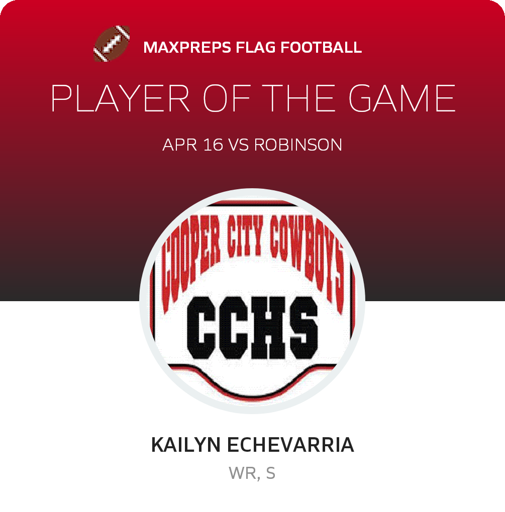Congratulations to #22 Kailyn Echevarria for being selected the Cooper City Girls Flag Football Player of the Game.