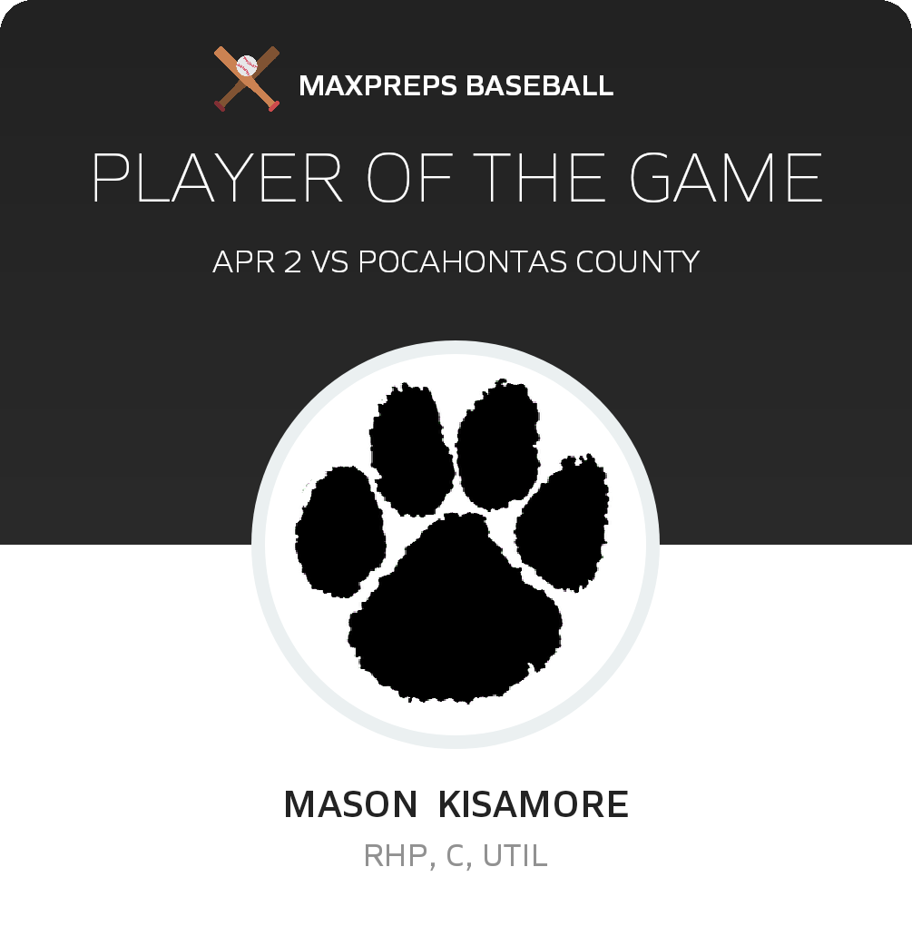 Congratulations to #13 Mason Kisamore for being selected the Tucker County Baseball Player of the Game.