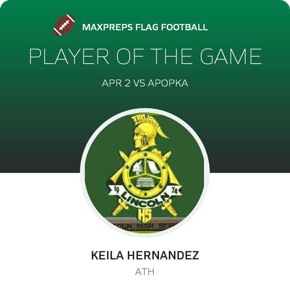 Congratulations to #12 Keila Hernandez for being selected the Lincoln Girls Flag Football Player of the Game.