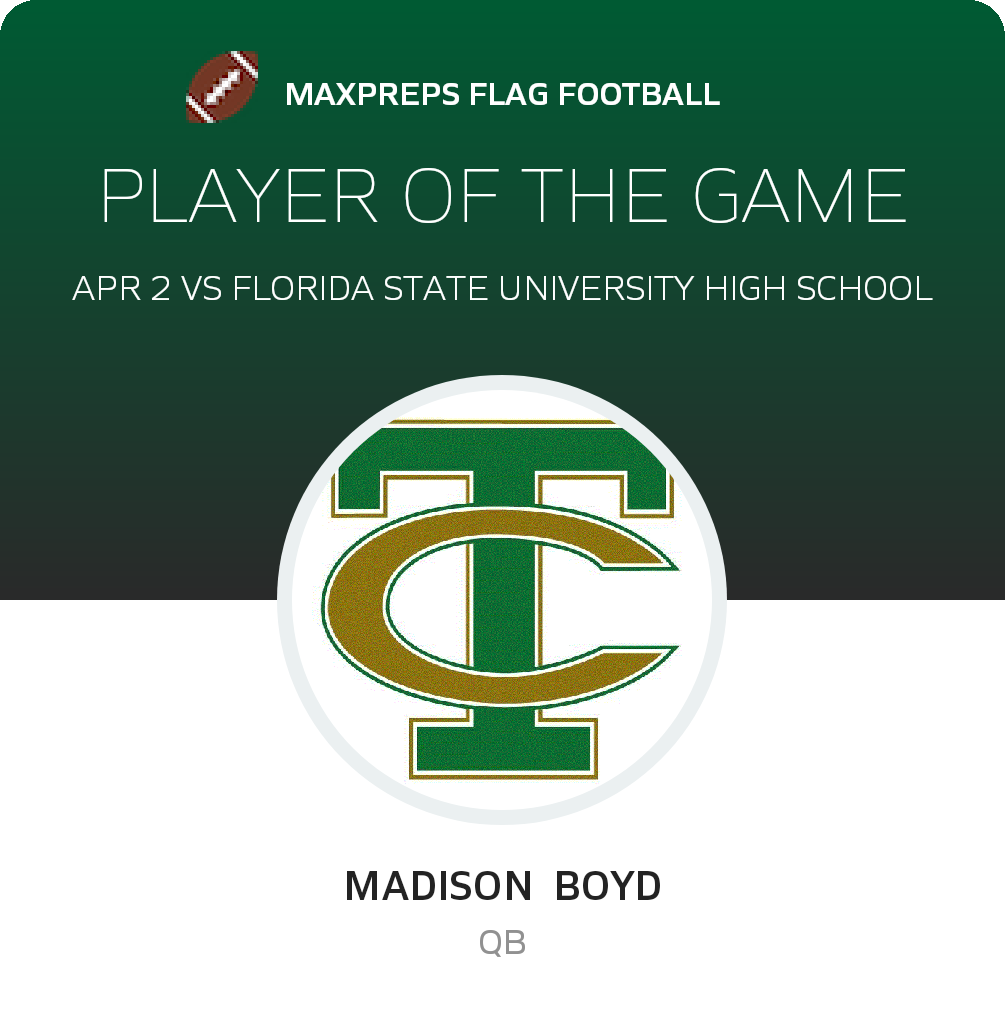 Congratulations to #16 Madison Boyd for being selected the Trinity Catholic Girls Flag Football Player of the Game.