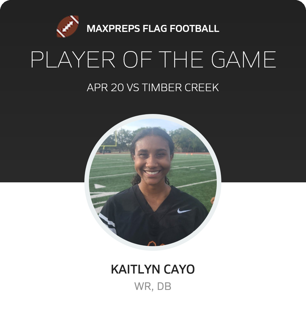 Congratulations to #4 Kaitlyn Cayo for being selected the Winter Park Girls Flag Football Player of the Game.