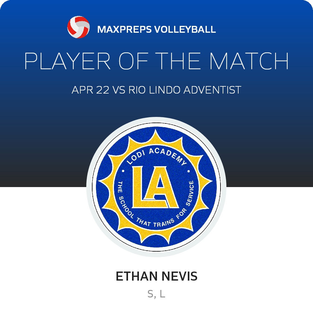 Congratulations to #1 Ethan Nevis for being selected the Lodi Academy Boys Volleyball Player of the Match.