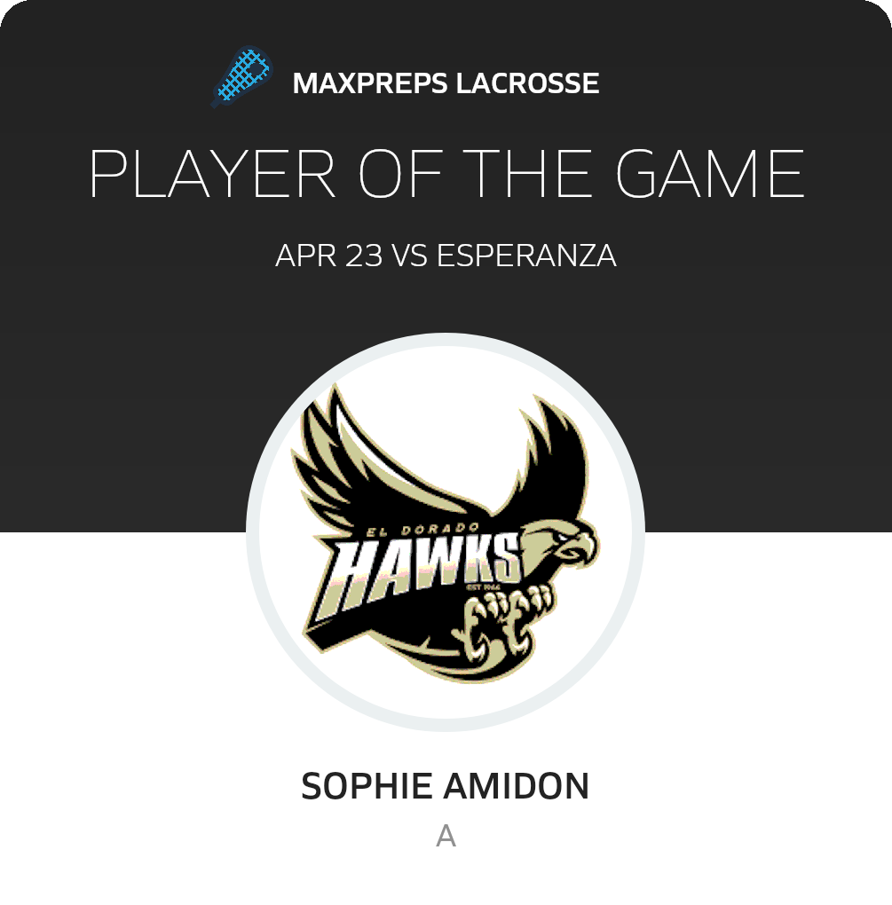Congratulations to #22 Sophie Amidon for being selected the El Dorado Girls Lacrosse Player of the Game.
