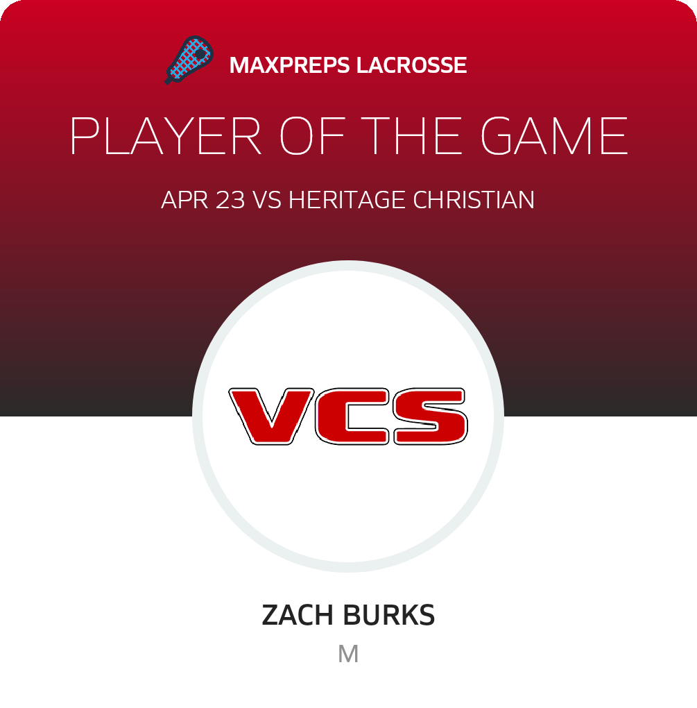 Congratulations to #28 Zach Burks for being selected the Village Christian Lacrosse Player of the Game.