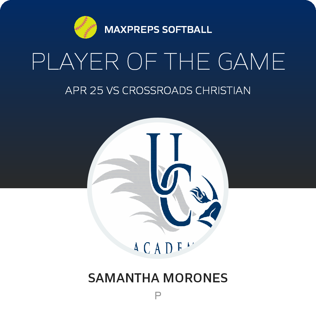 Congratulations to #11 Samantha Morones for being selected the United Christian Academy Softball Player of the Game.