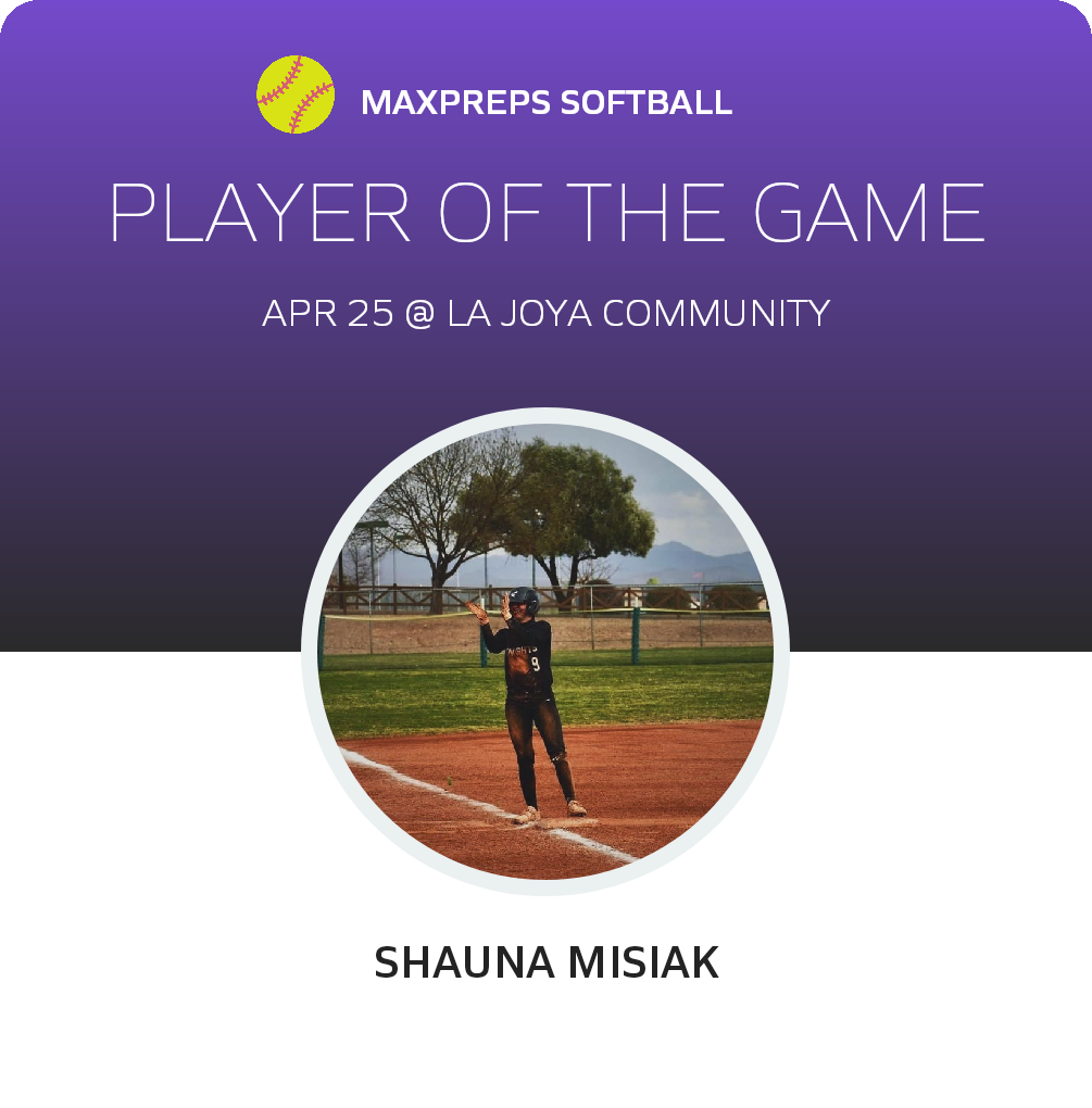Congratulations to #9 Shauna Misiak for being selected the Lake Havasu Softball Player of the Game.