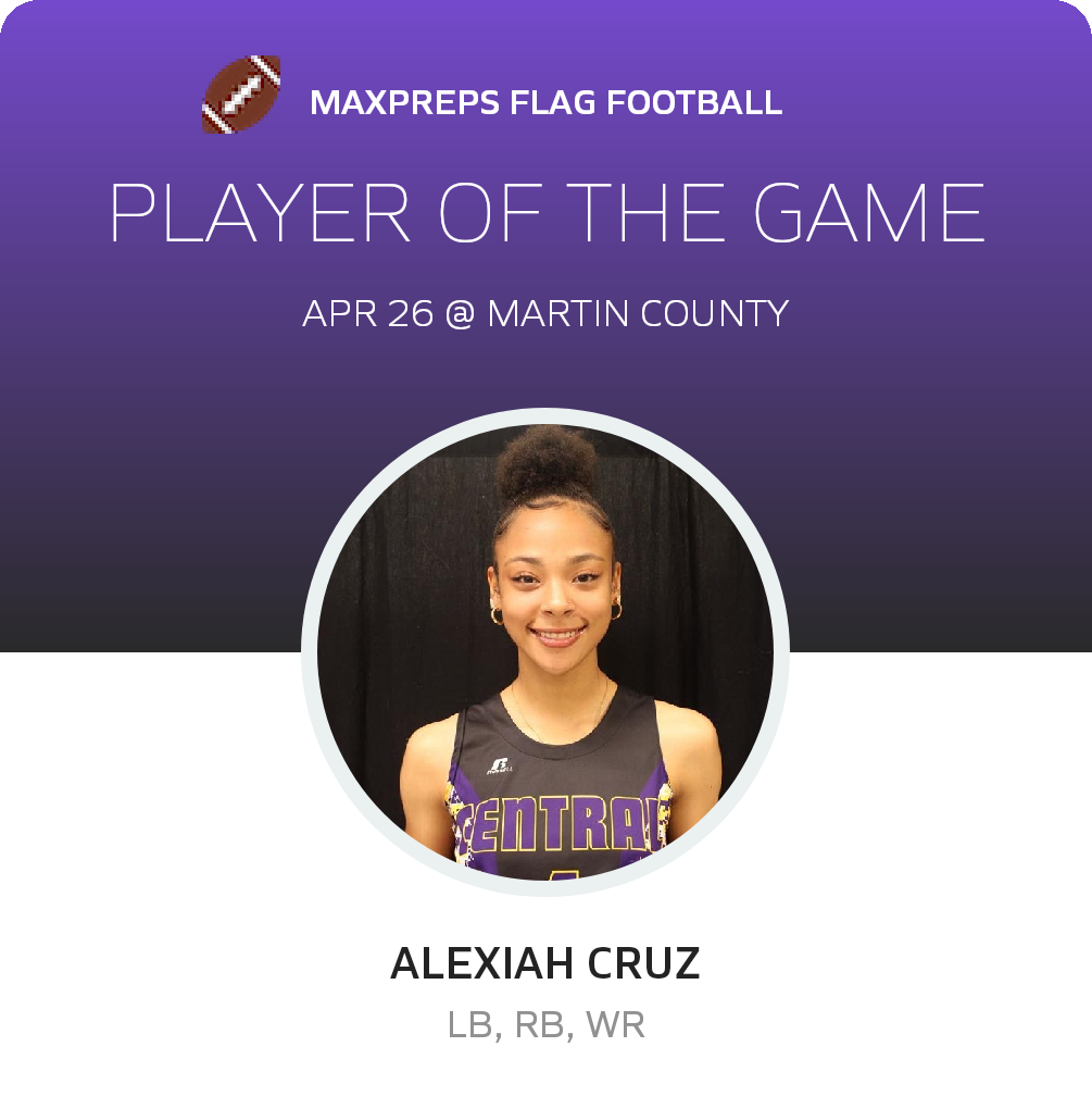 Congratulations to #4 Alexiah Cruz for being selected the Central Girls Flag Football Player of the Game.