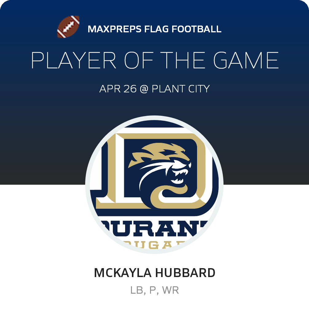 Congratulations to #23 McKayla Hubbard for being selected the Durant Girls Flag Football Player of the Game.