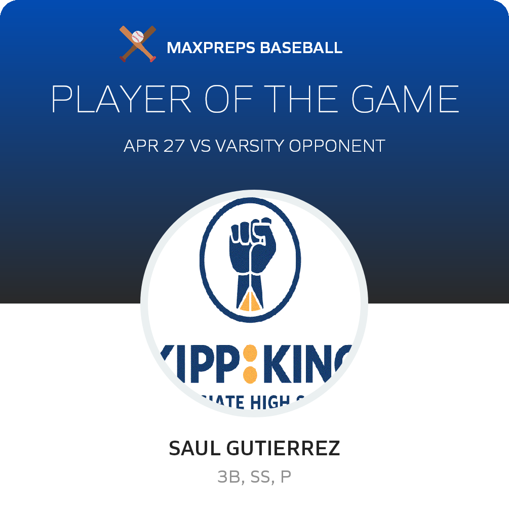 Congratulations to Saul Gutierrez for being selected the KIPP King Baseball Player of the Game.