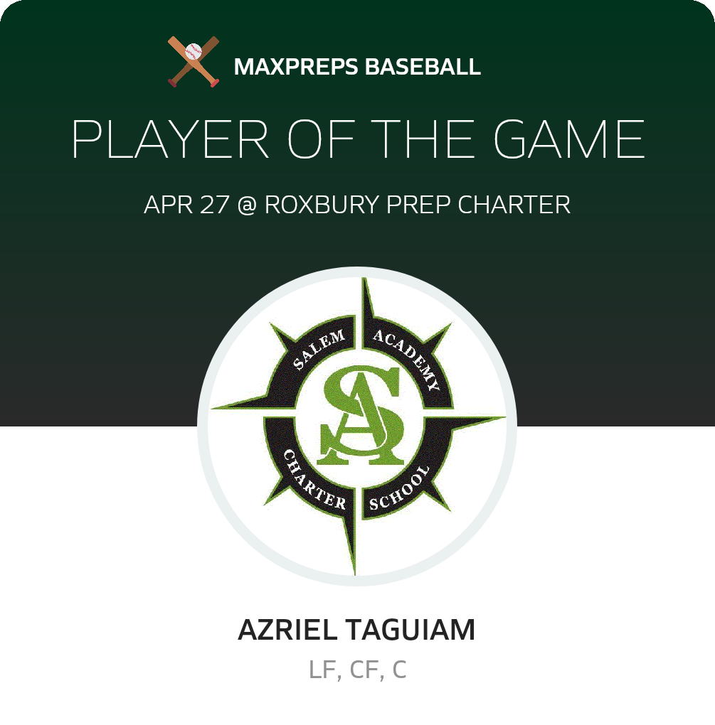 Congratulations to #0 Azriel Taguiam for being selected the Salem Academy Charter Baseball Player of the Game.