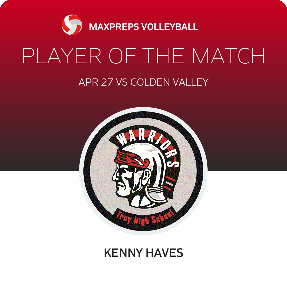 Congratulations to #16 Kenny Haves for being selected the Troy Boys Volleyball Player of the Match.