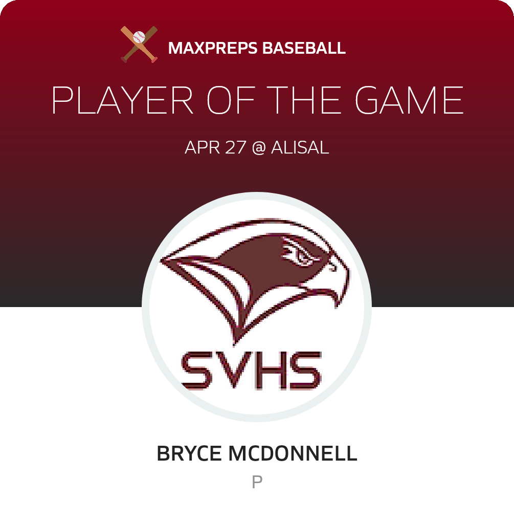 Congratulations to #14 Bryce McDonnell for being selected the Scotts Valley Baseball Player of the Game.