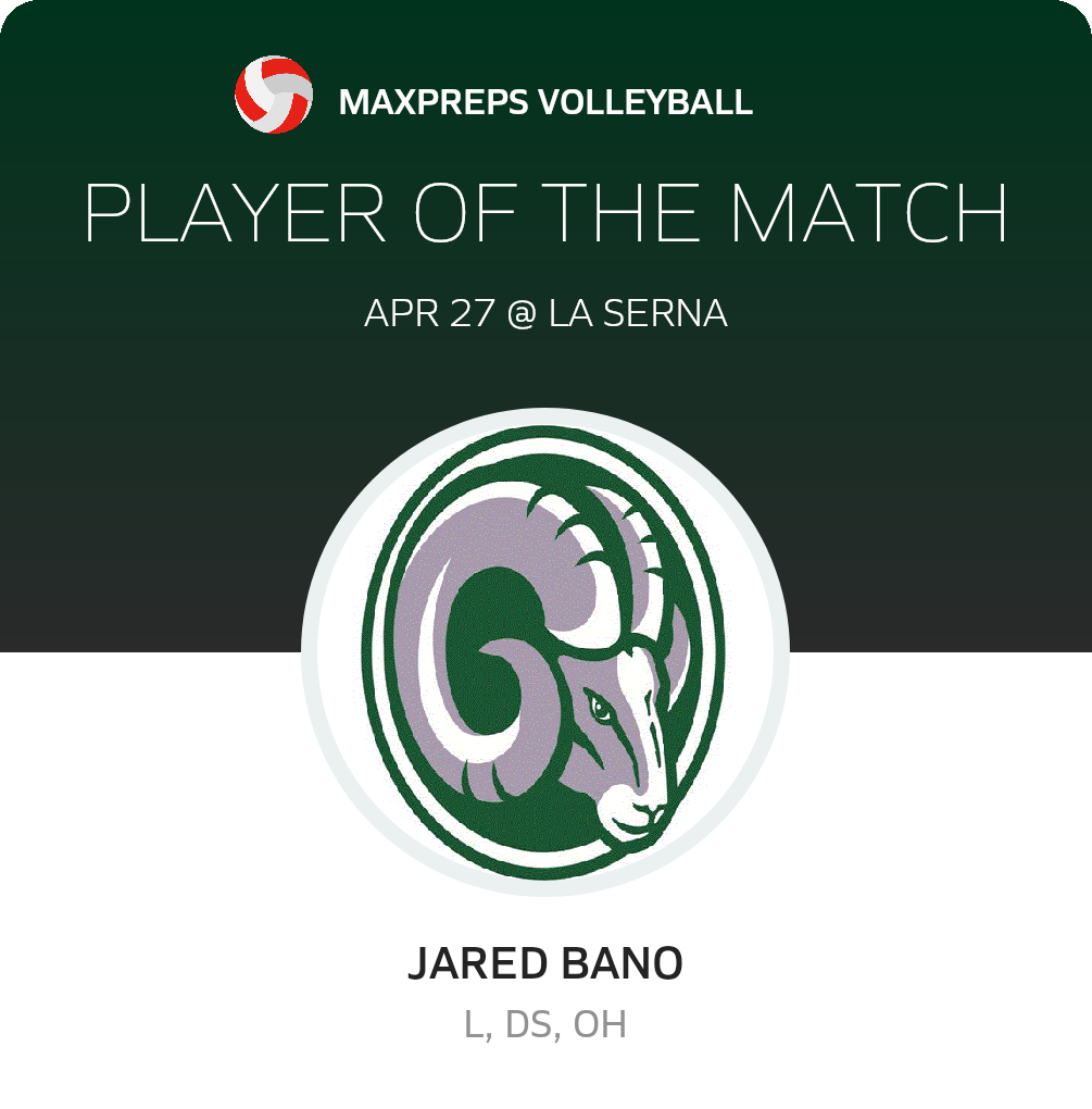 Congratulations to #7 Jared Bano for being selected the Murrieta Mesa Boys Volleyball Player of the Match.