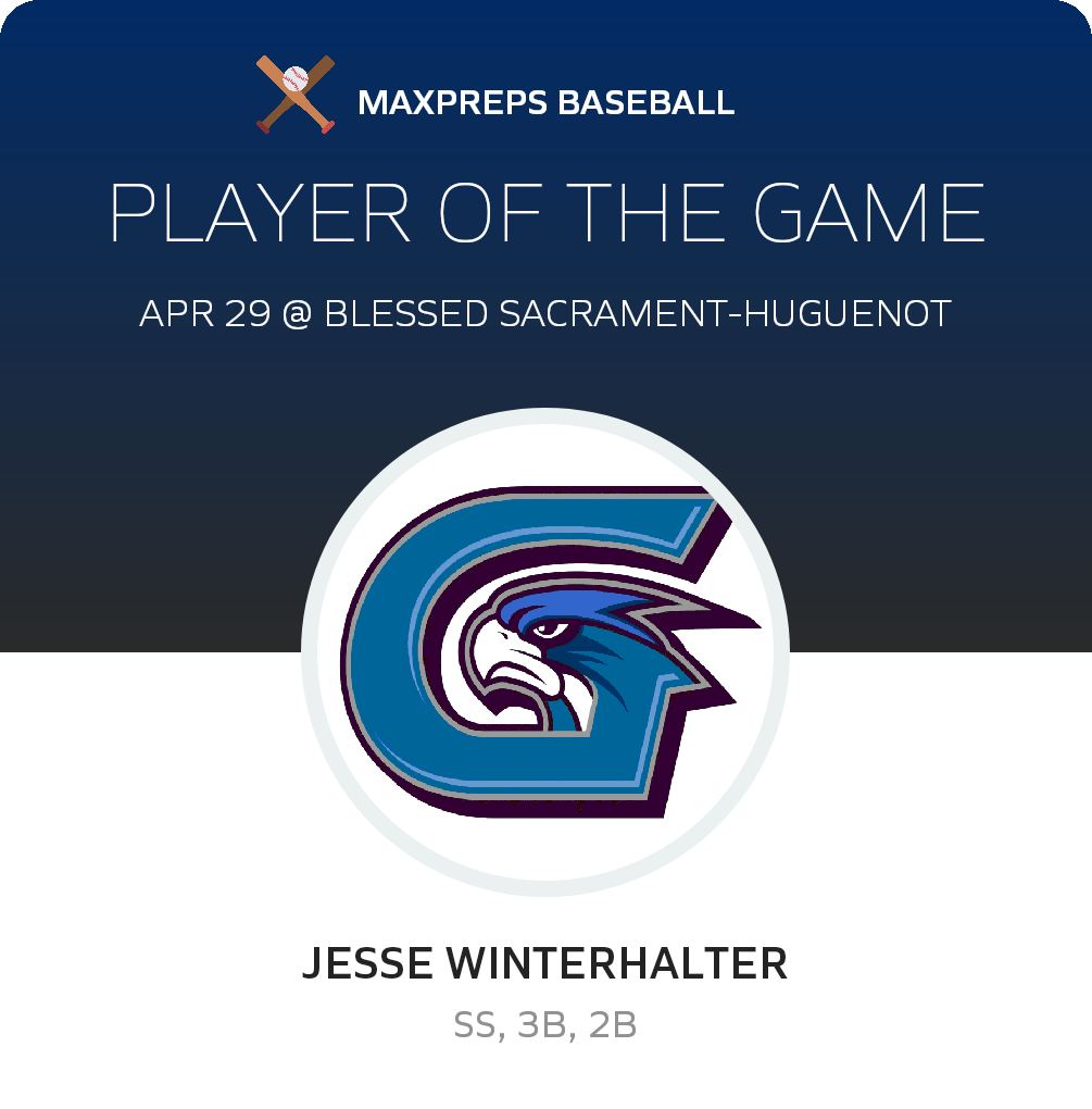 Congratulations to #4 Jesse Winterhalter for being selected the Grove Christian School Baseball Player of the Game.