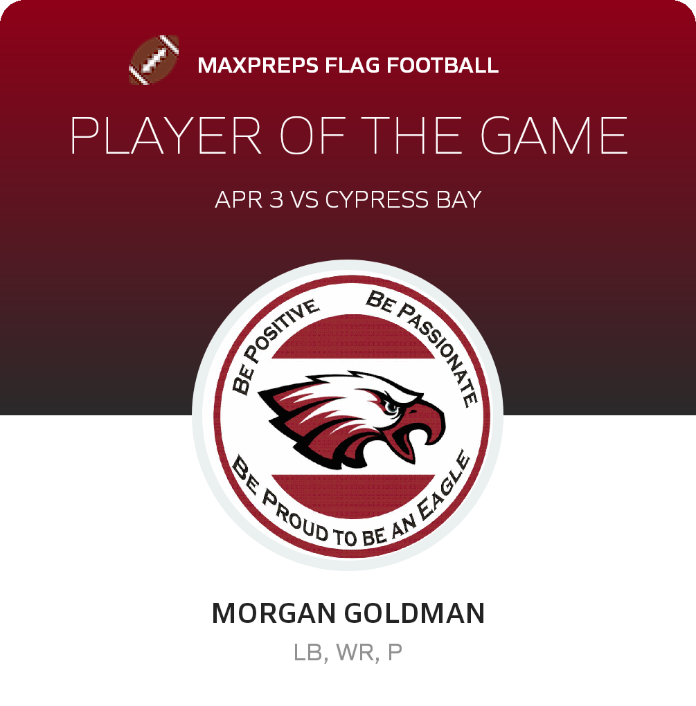 Congratulations to #11 Morgan Goldman for being selected the Stoneman Douglas Girls Flag Football Player of the Game.