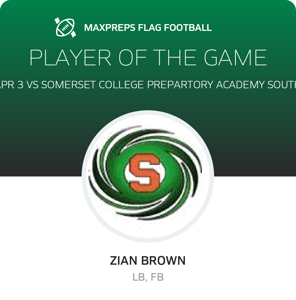 Congratulations to #16 Zian Brown for being selected the Somerset Academy South Homestead Girls Flag Football Player of the Game.