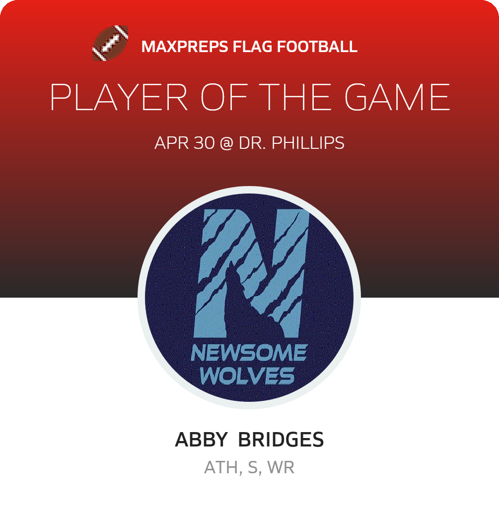 Congratulations to #4 Abby Bridges for being selected the Newsome Girls Flag Football Player of the Game.