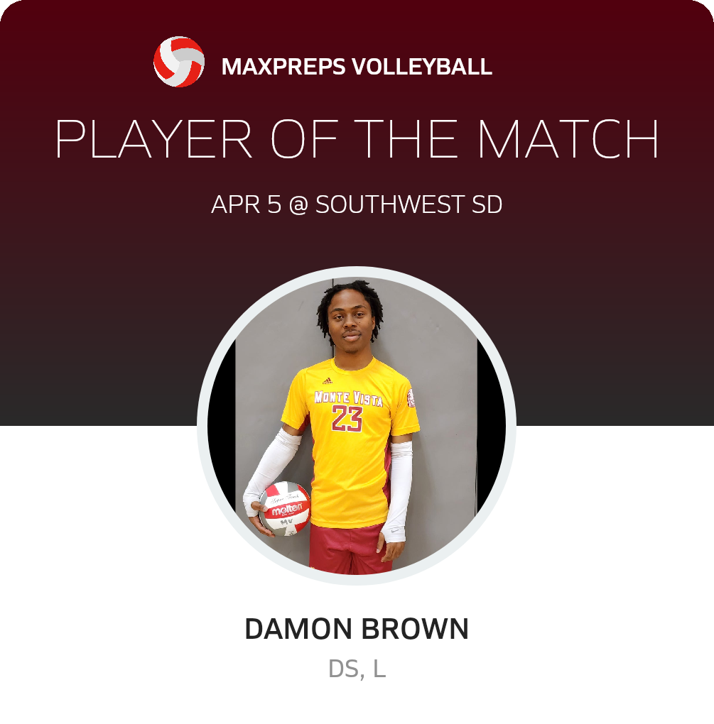 Congratulations to #23 Damon Brown for being selected the Monte Vista Boys Volleyball Player of the Match.