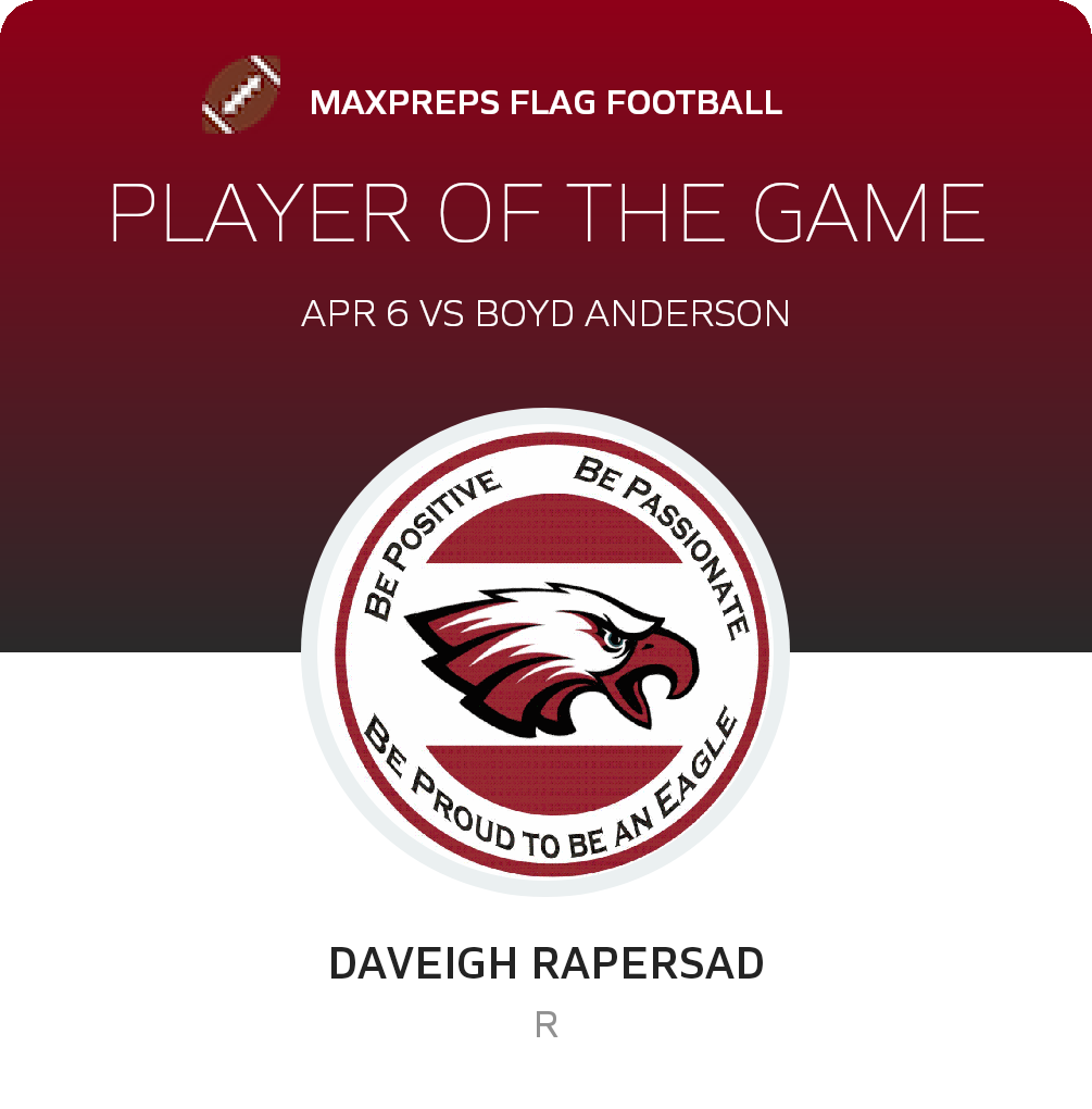Congratulations to #12 Daveigh Rapersad for being selected the Stoneman Douglas Girls Flag Football Player of the Game.
